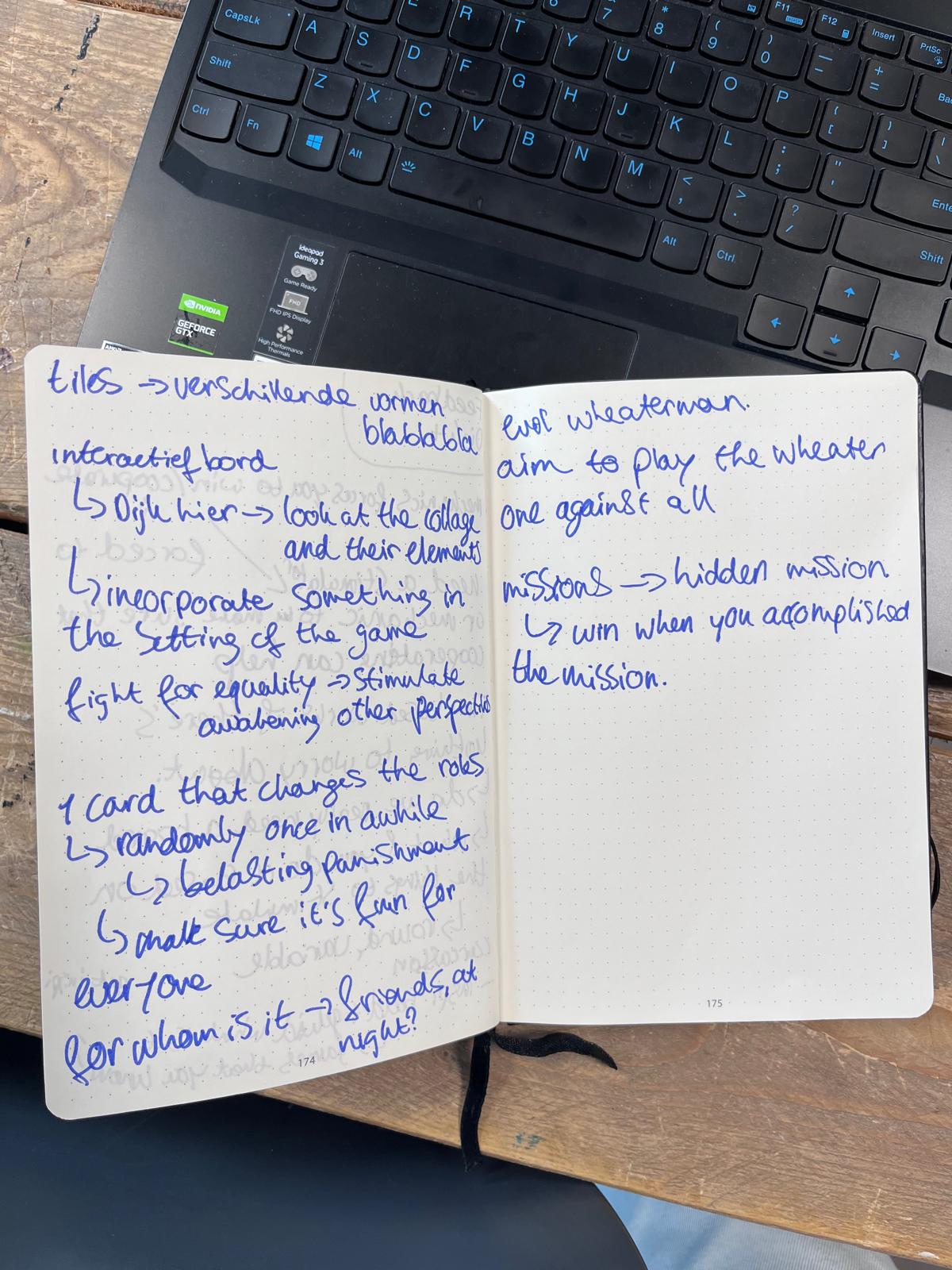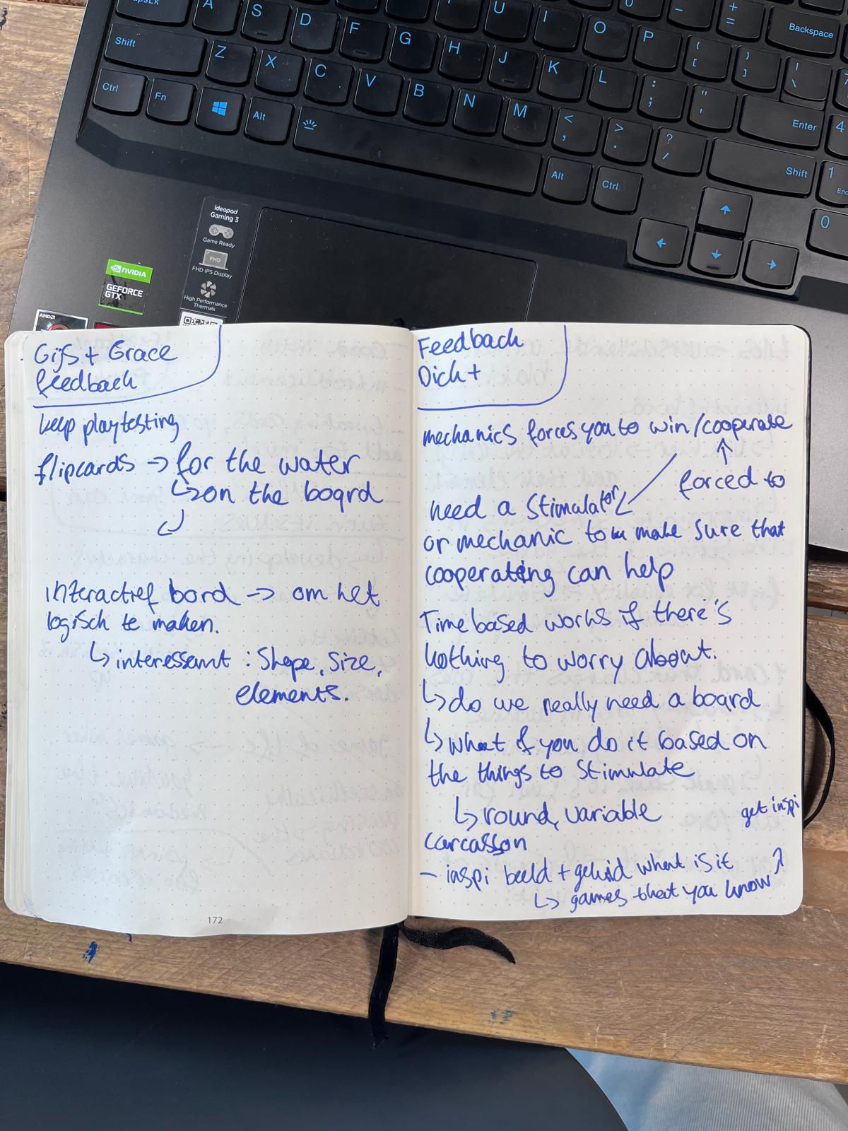 And the goal of the game is to keep your own land dry and to drain new land while earning points in the process. At the end of the game, the player with the most dry tails wins. The game ends as soon as at least 80% of the board has been drained. This means that players, whether they cooperate or compete, are jointly responsible for drying out the board. During the game you will constantly face choices. Do you play selfish, focusing on protecting your own land and get new land? Or do you cooperate and help others when their land floods so that the board as a whole stays striped? The game starts with an imbalance. Not everyone will receive the same amount of land or resources and this reflects how unfair the world can be divided. You will need to act strategically, negotiate and convince others to support you or try to survive on your own. And we also have the rules. I don't know if you're interested. Okay. Well, rules of the game. The start. Each player draws a land card. It shows how much land you control, your starting position, and the resources you have. The player with the weakest start, does the least land, goes first. Turns. On your turn, you may play, draw, or trade an action card. Example, to trade new land, get new land, move water around, or help slash sabotage another player. And then we play proceeds clockwise. The water level cards, after all players have taken the turns, you draw a water level card. It shows where and how much water is added. And this can affect your own lead, but also that of others. And so we will repeat. So that's where we are for now. And now we're in the testing phase. So our first trial, and we're just looking for how many cards from something we want to add in to keep it fun and completed. And we consider the time clock at the end, so the players feel more pressure to grow up at the end, because it needs to be dry. But for now, we're just playing together to look at what's interesting and what's not.
